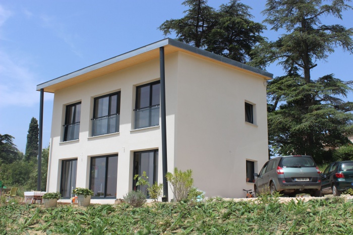 Cette maison bioclimatique, de forme compacte pour réduire au maximum ses déperditions thermiques, est orientée plein Sud (ce qui lui offre en outre de superbes vues sur les Pyrénées). Les baies vitrées du Sud sont protégées par une avancée de toit de 1m à l'étage et une pergola en casquette bois / métal au RDC. Ces protections ont été calculées par simulation thermique afin d'optimiser les apports solaires l'hiver et bloquer les rayons du soleil en été.