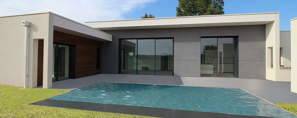 L'idée première est de créer un cocon autour de la piscine et de la terrasse. Pour cela, l'aile des parents viendra rencontrer l'aile principale permettant également un mariage de matériaux (panneaux en composite et bardage bois à lames verticales). La maison se veut également très ouverte sur le jardin. Le séjour et la chambre parentale bénéficient ainsi d'une double et triple orientation. Pour se protéger des surchauffes d'été, des brise-soleil orientables sont prévus sur toutes les baies orientées Sud, Ouest et Est. Une pergola permet d'ombrager une partie de la terrasse, à proximité de la jardinière à aromates, sous laquelle pourront se prendre les petits déjeuners et les diners d'été.