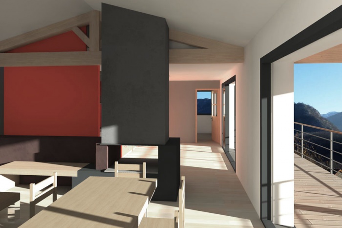 La composition compacte et le plan optimisé de la maison limitent le surcoût lié aux fondations spécifiques et augmentent son efficience énergétique. La cheminée/insert, source principale du système de chauffage est placée au centre. Le niveau bas reçoit les chambres; le niveau haut est réservé aux pièces de vie et flanqué d'une grande terrasse prolongeant les espaces intérieurs par l'intermédiaire de grandes baies exposées SUD. Les habitants profitent ainsi au maximum de l'environnement pyrénéen et des somptueuses vues sur le paysage lointain.